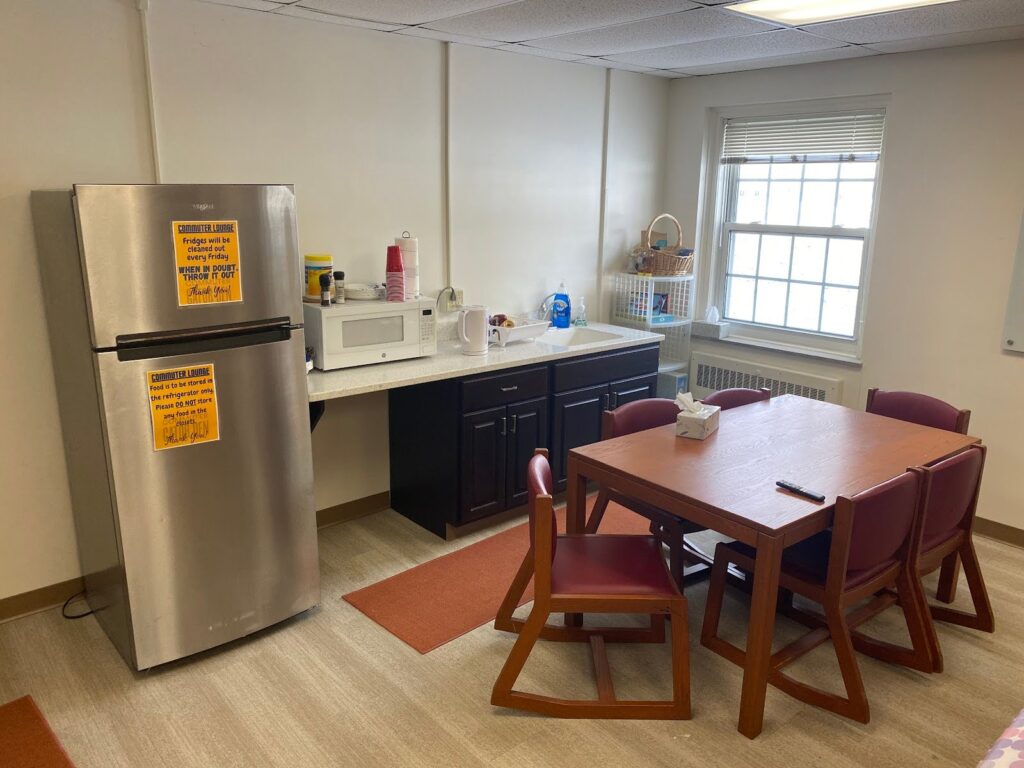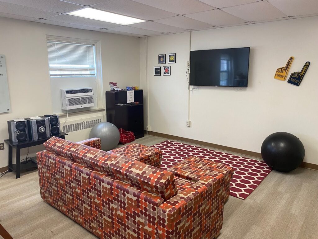 - Space includes: lockers, refrigerator, microwaves, dining area, TV, and couches