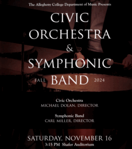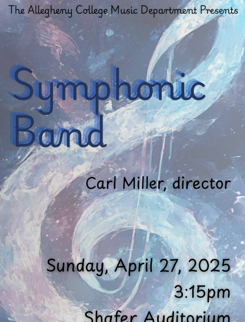 The Allegheny College Symphonic Band is open by audition to all Allegheny students, regardless of academic major. The ensemble performs one campus concert each semester, and serves as the parent ensemble for many of the instrumental chamber ensembles (Music 120s). Symphonic Band is active both semesters, and it carries one semester hour of academic credit. Questions regarding Symphonic Band should be directed to Professor Carl Miller in the Music Department.